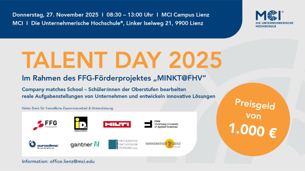 Nach der Kurzvorstellung der einzelnen Unternehmen trafen sich die Schüler:innen in Kleingruppen mit ihren Betreuer:innen. Die Firmen legten großes Engagement an den Tag, um die jugendlichen Teams optimal zu fördern. Wer war alles dabei? Euroclima, IDM, Stadt Lienz, HILTI, Gantner und Revital. Auf schulischer Seite lockte der Talent Day die HTL, HAK und die AWS der Dominikanerinnen in das Osttiroler MCI Gebäude. Somit ließen ca. 120 Schüler:innen die Köpfe rauchen, um nach dem Brainstorming innovative Lösungsansätze gut zu präsentieren. Gefragt waren Nachhaltigkeit, Kreativität und Zukunftsorientierung. Unsere Schule nahm mit 3 KLassen (4AK, 4BK und 4CK) teil. Die Themen waren teilweise sehr anspruchsvoll und technisch, z.B. beschäftigte sich die HAK 4B mit neuer Wärmepumpen-Technologie.